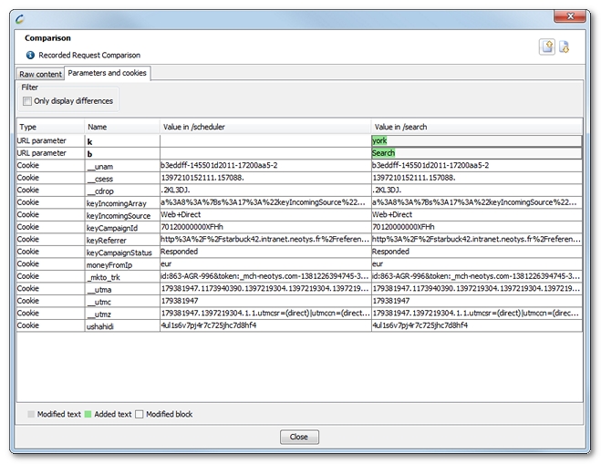 Information: You can filter the results to show only the parameters or cookies whose values differ between the two requests.