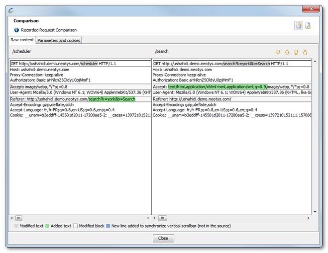 A request comparison can be carried out in two ways. The first compares the raw content of the requests and the second their parameters and associated cookies.