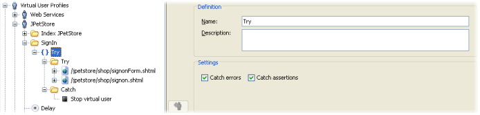 The Try...Catch action is used to execute specific actions in the case of an error or validation failure. A Try...Catch action can capture errors or assertions (validation errors) or both.