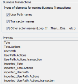 When the Nudge APM integration module is enabled, the context for the transaction names are made of the User Path names, Transaction names, and other action names by default. In the Nudge APMpreferences panel, the Business Transactions group box makes it possible to select which element must be included in the transaction names.